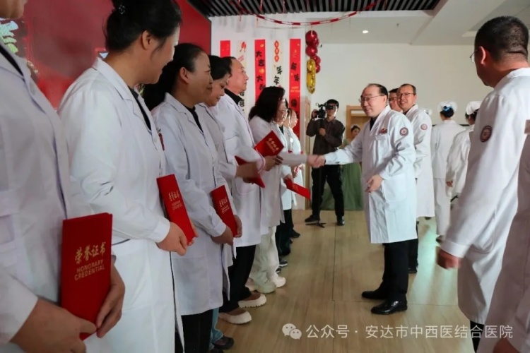 联欢会现场最令人动容的环节,莫过于为从业30年的医护前辈颁发荣誉证书。三十年初心如磐,三十年躬身笃行。他们将人生最宝贵的年华奉献给了医疗卫生事业,以白衣为甲,在救死扶伤的战场上默默坚守;以仁心为灯,在守护健康的道路上步履不停。在全场热烈的掌声中,领导们上台为前辈们颁发荣誉证书,这一纸荣光,是对他们三十年坚守的最高致敬,更是对医者精神的传承与弘扬。前辈们眼中的泪光与脸上的笑容,映照出“一生医者路,满腔济世情”的赤诚,也为后辈们树立了最鲜活的榜样。